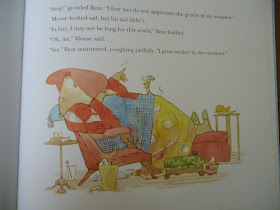 This is a pitch perfect book in both text and illustration. It captures both the grumpy misery of a cold and the secret pleasure that may be derived from a self pitying wallow in such grumpy misery. Bear droops himself around in a spreading, sighing, notice me sort of way very familiar to anyone who has had to play nurse. Poor Mouse finds that every suggestion he makes is wrong (also rather familiar) and is reduced to transcribing Bear's dictated will. At least there may be a red roller skate bequest coming for his labours.